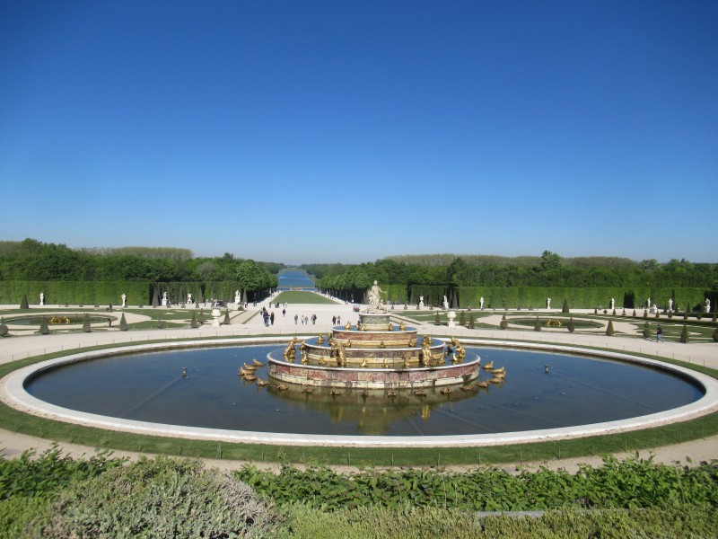 Weil ich bereits ca. 10 Uhr da bin, kann ich schon mal einen Blick in den weiten Park hinterm Schloß werfen. Wow, ist der riesig! Bis zum zweiten großen Springbrunnen steige ich hinab und gucke, wie es danach weiter geht. Dann muss ich schon wieder hinauf, um meine Schloßführung nicht zu verpassen.