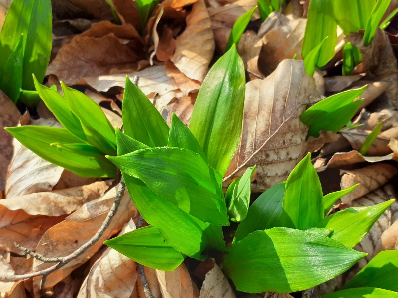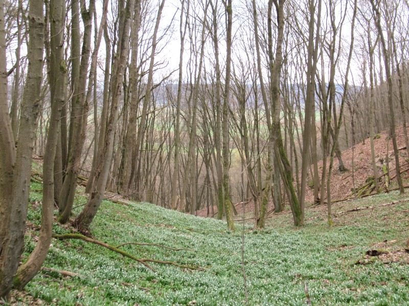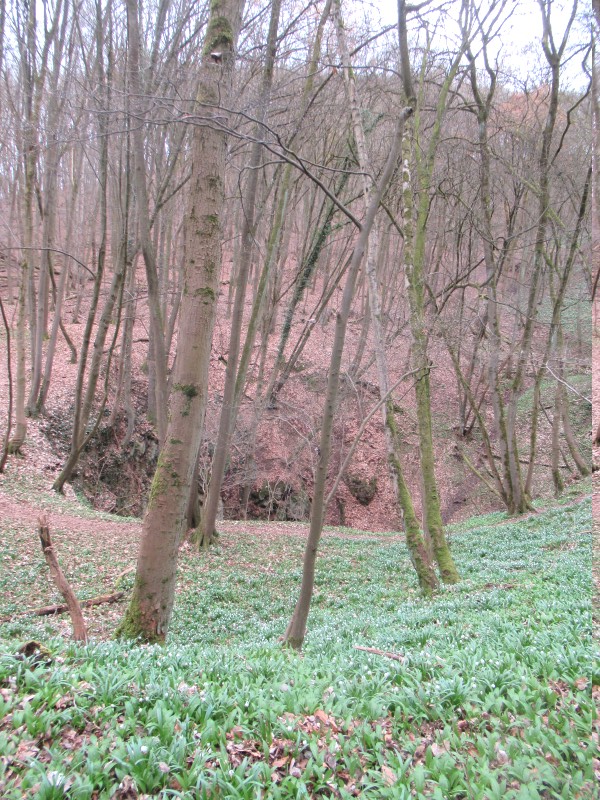 An der Reesbergdoline ist der ganze Wald voller Märzenbecher. Die müssen sich sputen mit ihrer Blüte, damit sie nicht vom üppig sprießenden Bärlauch verschluckt werden.