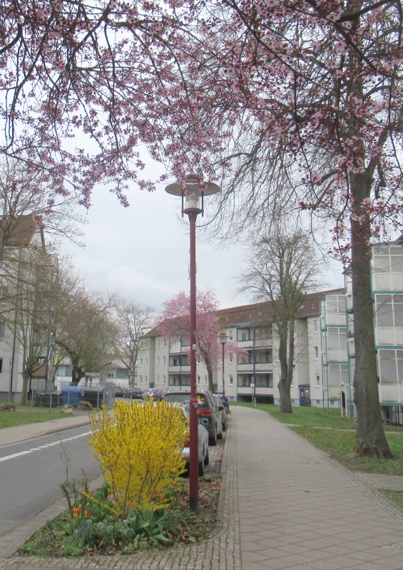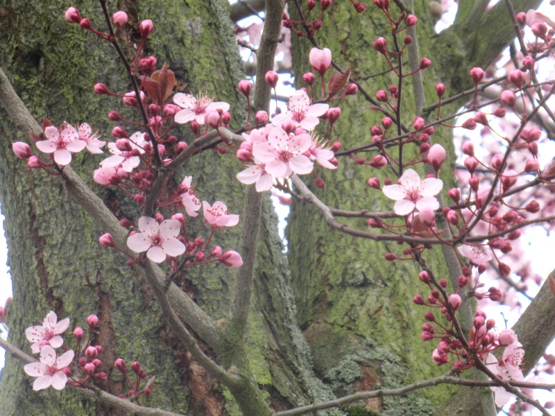 Auf meinem Heimweg mache ich fix noch ein Foto von den herrlichen rosa Blüten im Wohngebiet. Nein, es sind keine Mandelbäume, die hier blühen. Es sind Kirschpflaumen.